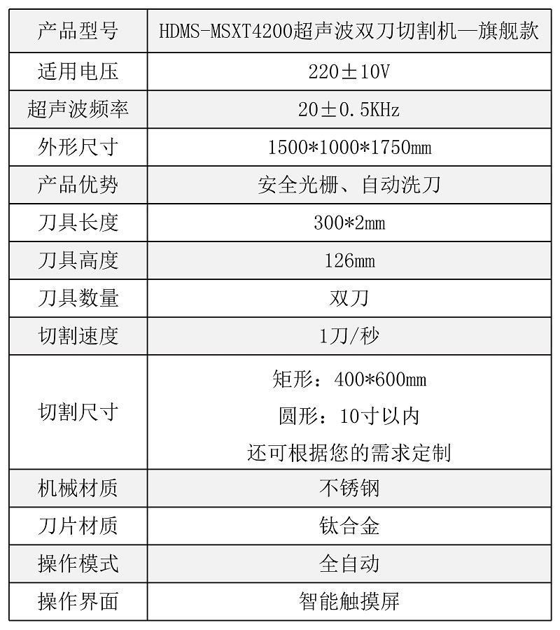 該設(shè)備配備雙把超聲波刀片,既可切方蛋糕,也可同時(shí)切兩個(gè)圓蛋糕,效率更高
