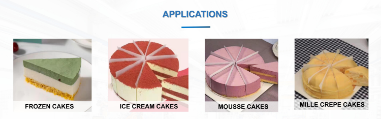 Ultrasonic cake divider inserts are designed for round cakes. They are automatic machines that will realize cake cutting and paper dividers inserting between each slice within one operation. Compared with manual cake divider inserting, the ultrasonic cake divider inserts can save labor cost, reduce manual error, and improve work efficiency. This model adopts steel blade, reducing cost, increasing cutting speed. It has two round turntables in a rotating platform, which allows it to cut two products alternately.