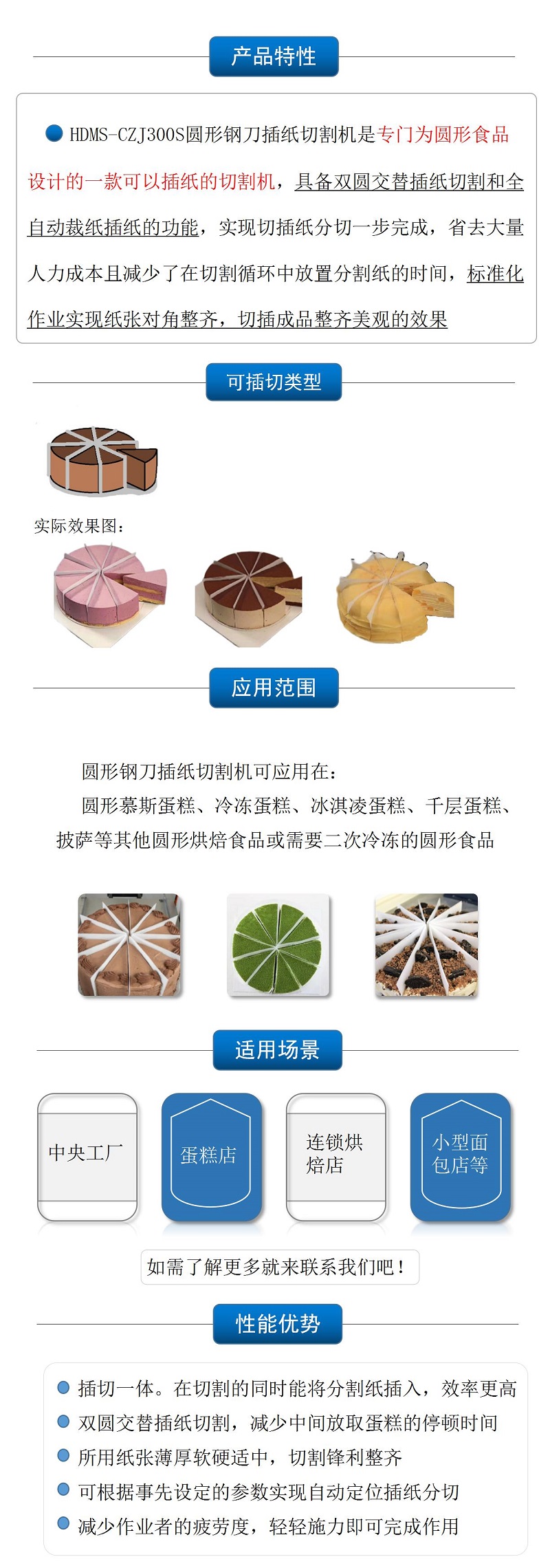 該設(shè)備利用超聲波高頻振動切割,可同時插紙切割一個圓形的蛋糕 |